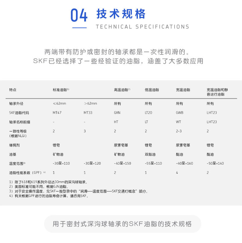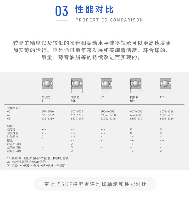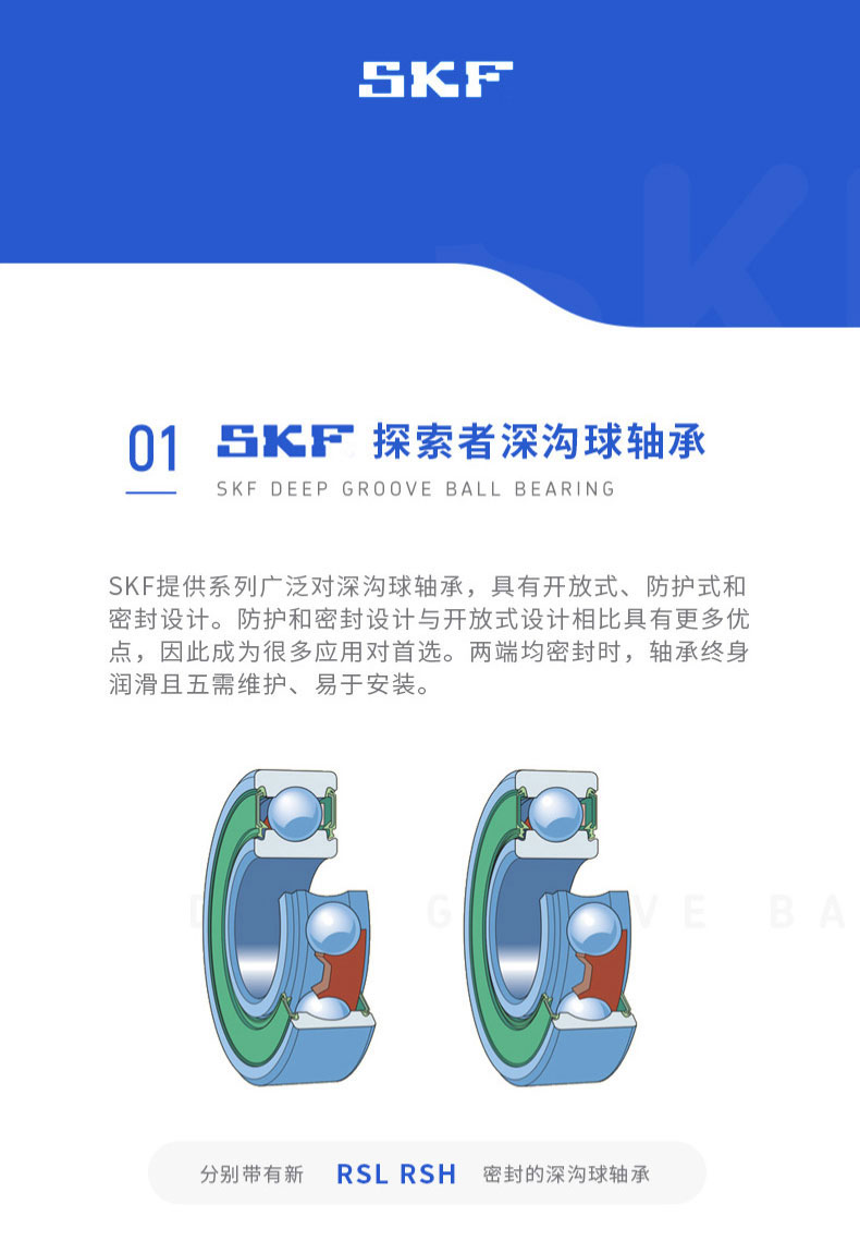 SKF深溝球軸承是一種儀器器件,有開式、雙面帶密封圈,帶密封的軸承在外圈上開有可裝密封圈或防塵蓋的溝槽,適用于高轉速甚至極高轉速的運行。